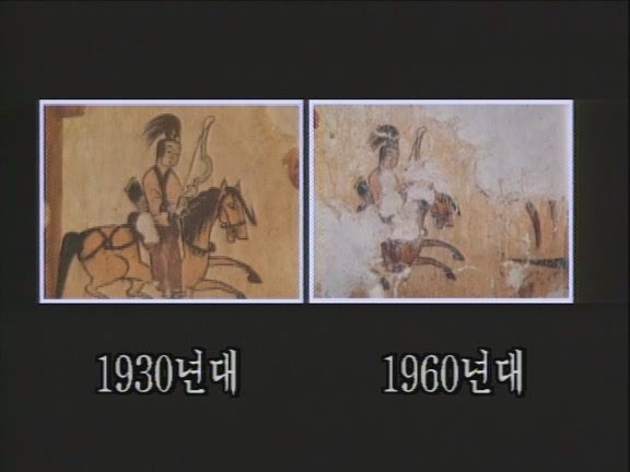 최근 화면에 담긴 벽화 모습은 이처럼 색이 바랜데다, 그 나마 군데군데 벽면이 떨어져 나가 그 원형을 알아보기 조차 힘들다. 특히 중국 측이 벽화를 보존한다며, 화학안료막을 입혀 벽화는 지금 내부에서부터 부식돼 가는 중이라고 한다. 제작팀은 KBS 특수영상제작실과 함께 무용총 복원에 들어갔다. 첫 난관은 이렇게 훼손된 상태에서 벽화 본래의 모습과 색을 어떻게 알아내는가 하는 점이었다. 제작팀은 가급적 오래된 사진도록을 참조하기로 했다. 하지만 1960년대의 사진은 형체를 알아 볼 수 없는 부분이 많았고, 윤곽이 제대로 남아있는 30년대 도록은 그 색이 분명치 않았다.