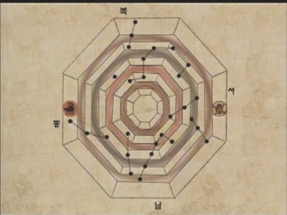 “벽면 위에 팔단으로 만들어져 있는데 삼단까지는 평행으로 하여가지고 들여쌓기를 하였고 사단부터 팔단까지는 팔단팔각으로 각을 죽여가면서 점점 들여쌓기를 했습니다. 밑에서 보면 팔각에 천정이 5개가 위로 점점 안으로 좁혀져가면서 천정꼭대기까지 들어가는 이런 모양을 보여주고 있습니다.”